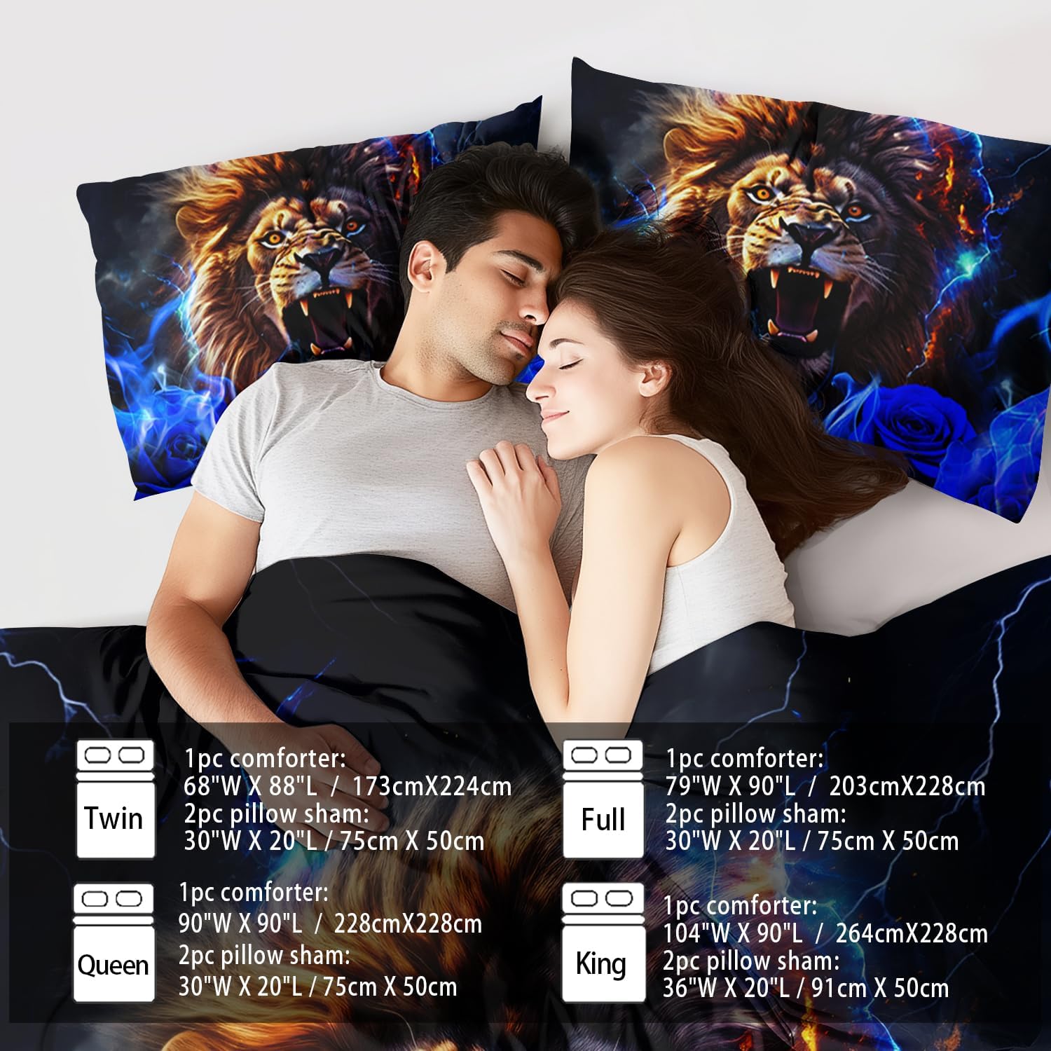 - King Size Fashion Lion Comforter Set :This bedding set includes 1 comforter(67" x 85") and 2 pillowcases(20”x30”). In order to facilitate transportation, the quilt is made of vacuum compression technology. It will be slightly wrinkled when taken apart, but it will quickly regain its fluffiness if you gently beat it.