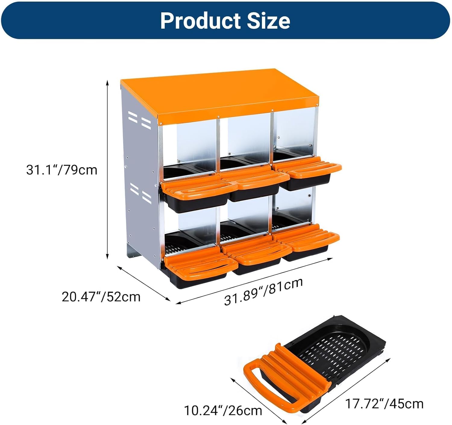 Chicken Nesting Boxes, 6 Hole Metal Chicken Laying Box with with Removable Trays and Roll Out Egg Collection for Chicken Coop, Orange