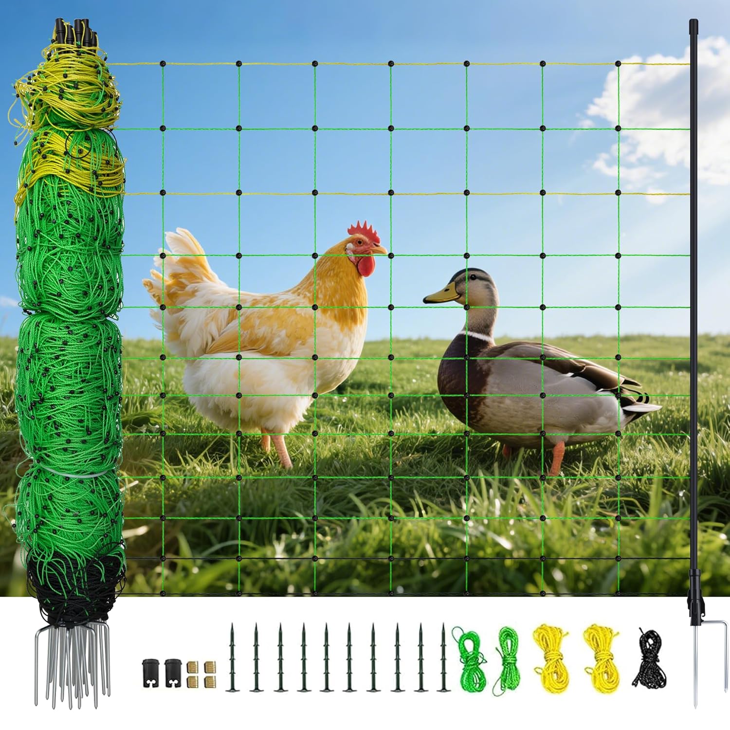 - High-Quality Construction: 49.6" H x 164'L Our Electric Fence Netting is crafted from durable PE material and stainless steel mesh, ensuring superior longevity and performance. With 14 pre-assembled fiberglass posts and double-point steel stakes, you can trust in its strength for long-term use.