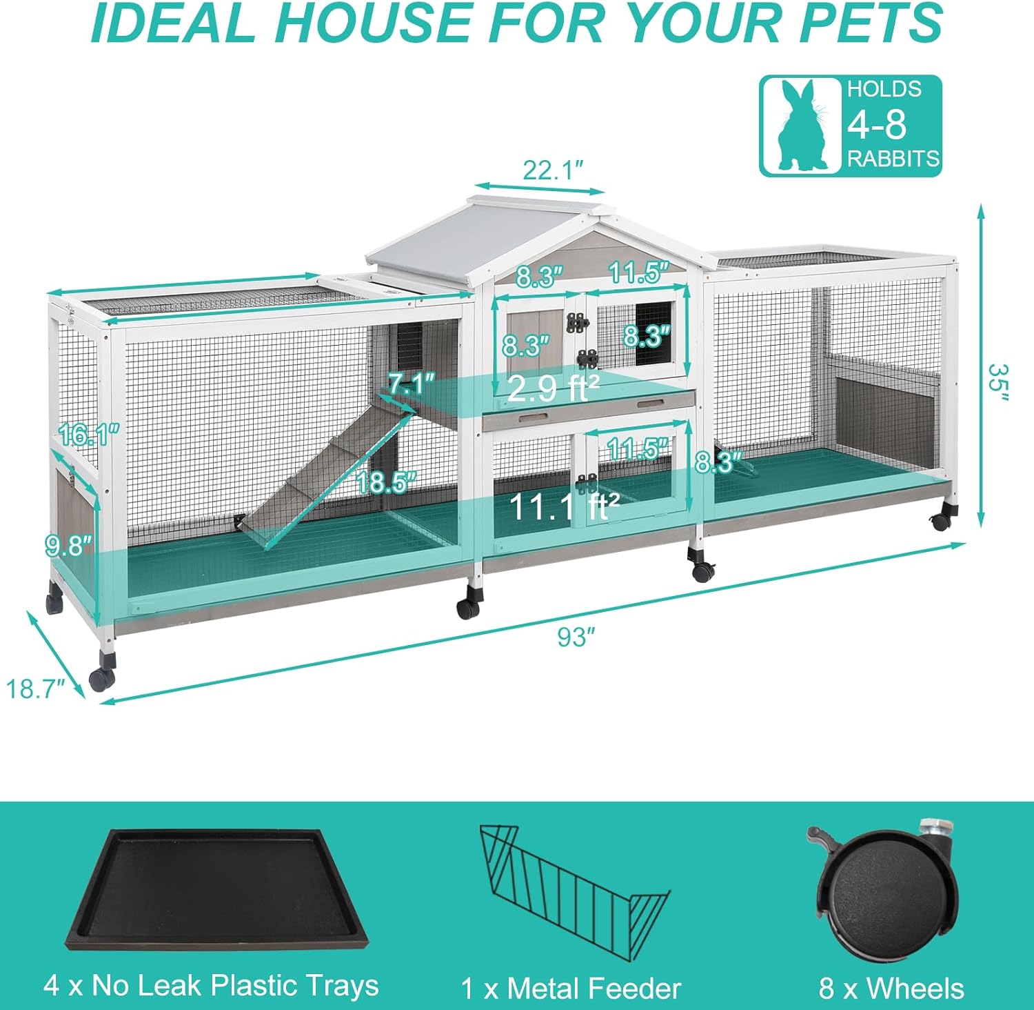 2-Tier Rabbit Hutch with Wheels, Indoor & Outdoor Small Animal Cage with Deep Pull-Out Tray, Anti-Chew Frame, Habitat for Bunny, Guinea Pig, Chinchilla (93" L x 19" W x 35" H)